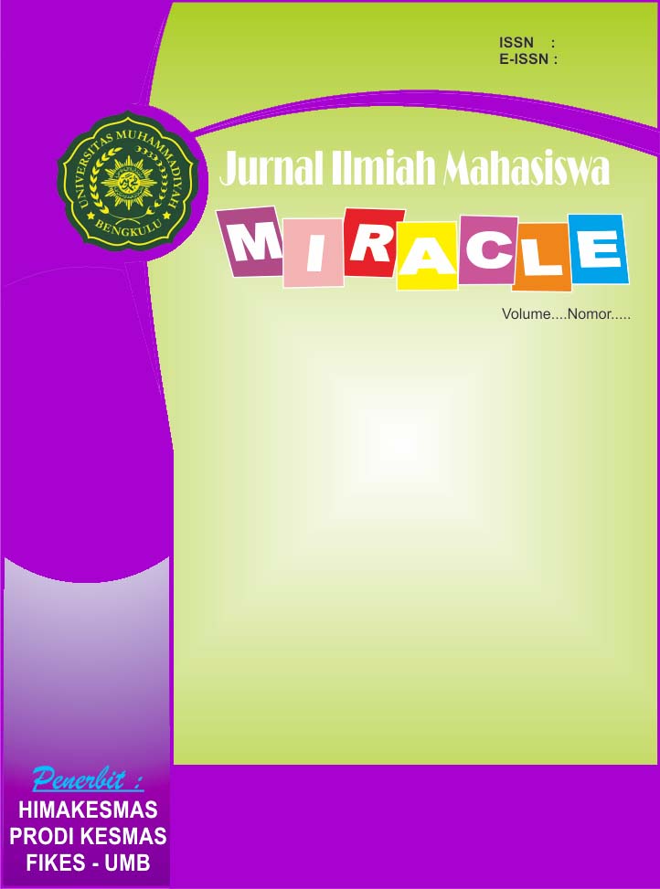 Jurnal Ilmiah Mahasiswa Miracle (JIMM) merupakan Jurnal Prodi Kesehatan Masyarakat Fakultas Ilmu Kesehatan Universitas Muhammadiyah Bengkulu Terbit 2 kali dalam satu tahun yaitu Bulan Juli dan Desember. Dipublikasikan oleh Prodi Kesehatan Masyarakat Fakultas Ilmu Kesehatan Universitas Muhammadiyah Bengkulu yang memuat naskah di bidang Kesehatan Masyarakat yang meliputi: lingkup gizi kesehatan masyarakat, epidemiologi, kesehatan lingkungan, kesehatan reproduksi, pendidikan kesehatan dan ilmu prilaku, admnistrasi dan kebijakan kesehatan, manajeman pelayanan kesehatan, keselamatan dan kesehatan kerja. Pemuatan jurnal ini dialamatkan ke kantor redaksi editor atau melalui email: jurnalmiracle@umb.ac.id