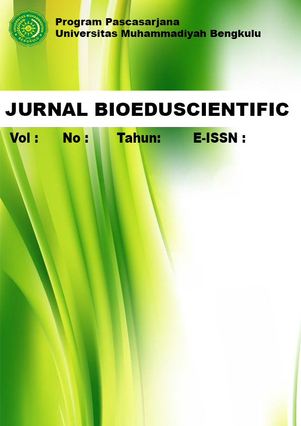 Jurnal Bioeduscientific merupakan terbitan Program Pascasarjana Program Studi Magister Pendidikan Biologi Universitas Muhammadiyah Bengkulu dibidang Pendidikan Biologi, Biologi Murni dan Pendidikan IPA. Jurnal Bioeduscientific terbit secara berkala 2 kali dalam setahun, yaitu bulan Maret dan September. Jurnal Bioeduscientific sebagai wadah publikasi dibidang Pendidikan Biologi, Biologi Murni dan Pendidikan IPA untuk mahasiswa, guru, dosen, dan para peneliti dibidang Pendidikan Biologi, Biologi Murni dan Pendidikan IPA.