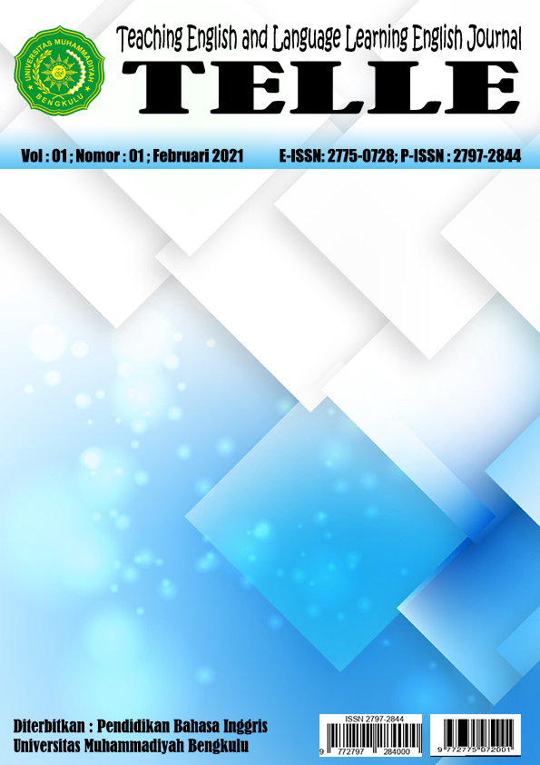 Teaching English and Language Learning English Journal (TELLE) is open access Journal which published three times in a year in February, July and December. The aim is to publish research articles for educators, researchers, professional to share their idea on all topics related to English language teaching and learning English and the everyday experience of language in education. We accept mainly research-based articles related to English Education and Teaching, English literature in ELT, and linguistics. This journal is published by English Education Program of Faculty of Teacher Training Muhammadiyah University of Bengkulu.