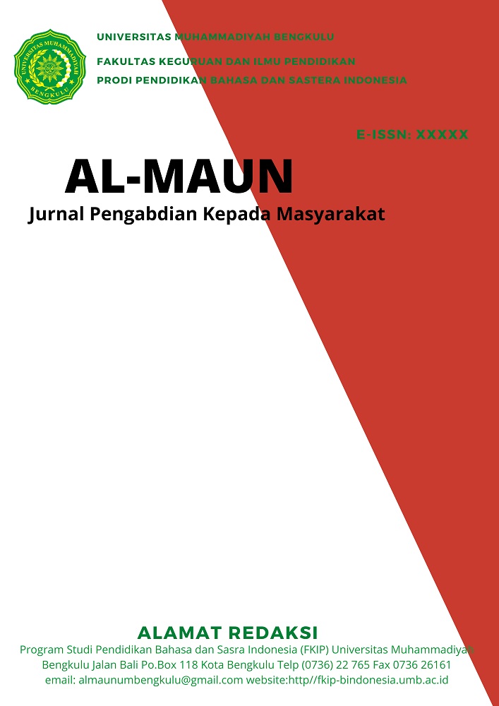 Jurnal Al-Maun merupakan Jurnal Pengabdian Kepada Masayarakat yang diterbitkan oleh Program Studi Pendidikan Bahasa dan Sastra Indonesia, Fakultas Keguruan dan Ilmu Pendidikan, Universitas Muhammadiyah Bengkulu. Jurnal ini merupakan media informasi, komunikasi dan sosialisasi hasil-hasil pengabdian masyarakat bagi Dosen dan Peneliti. Artikel yang dimuat dalam jurnal ini berkaitan dengan hasil-hasil pegabdian kepada masyarakat, ide-ide bersifat interdisipliner atau ide-ide kreatif lainnya yang bersifat konstruktif. Jurnal ini diterbitkan dua kali dalam setahun (Juni dan Desember).