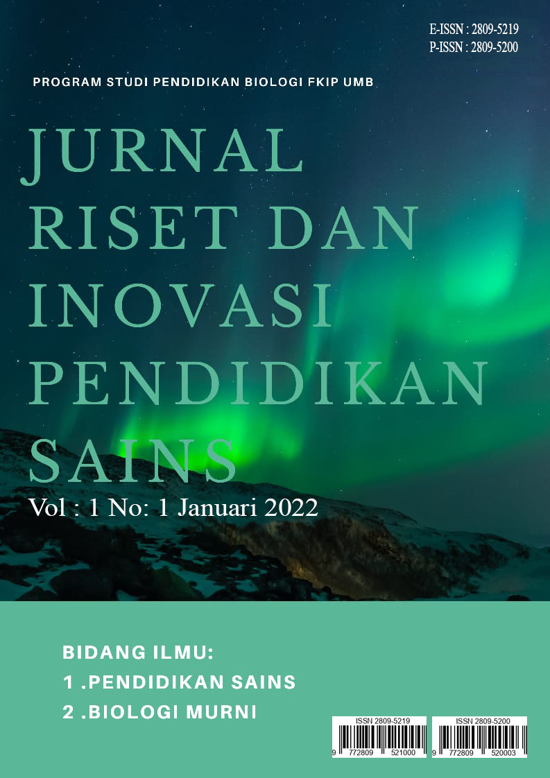 diterbitkan dua kali dalam satu tahun. Merupakan jurnal penelitian yang menyajikan artikel-artikel dalam 2 bidang ilmu yaitu pendidikan sains (Kurikulum, Inovasi, Media, Assesment, Evaluasi, Manajemen dan Kebijakan, studi literature, eksperimen serta aplikasinya dalam pembelajaran. Biologi Murni (Keragaman hayati, ekologi, lingkungan). Setiap naskah yang dikirim ke Jurnal Riset dan Inovasi Pendidikan Sains akan direview oleh pakar dibidangnya.