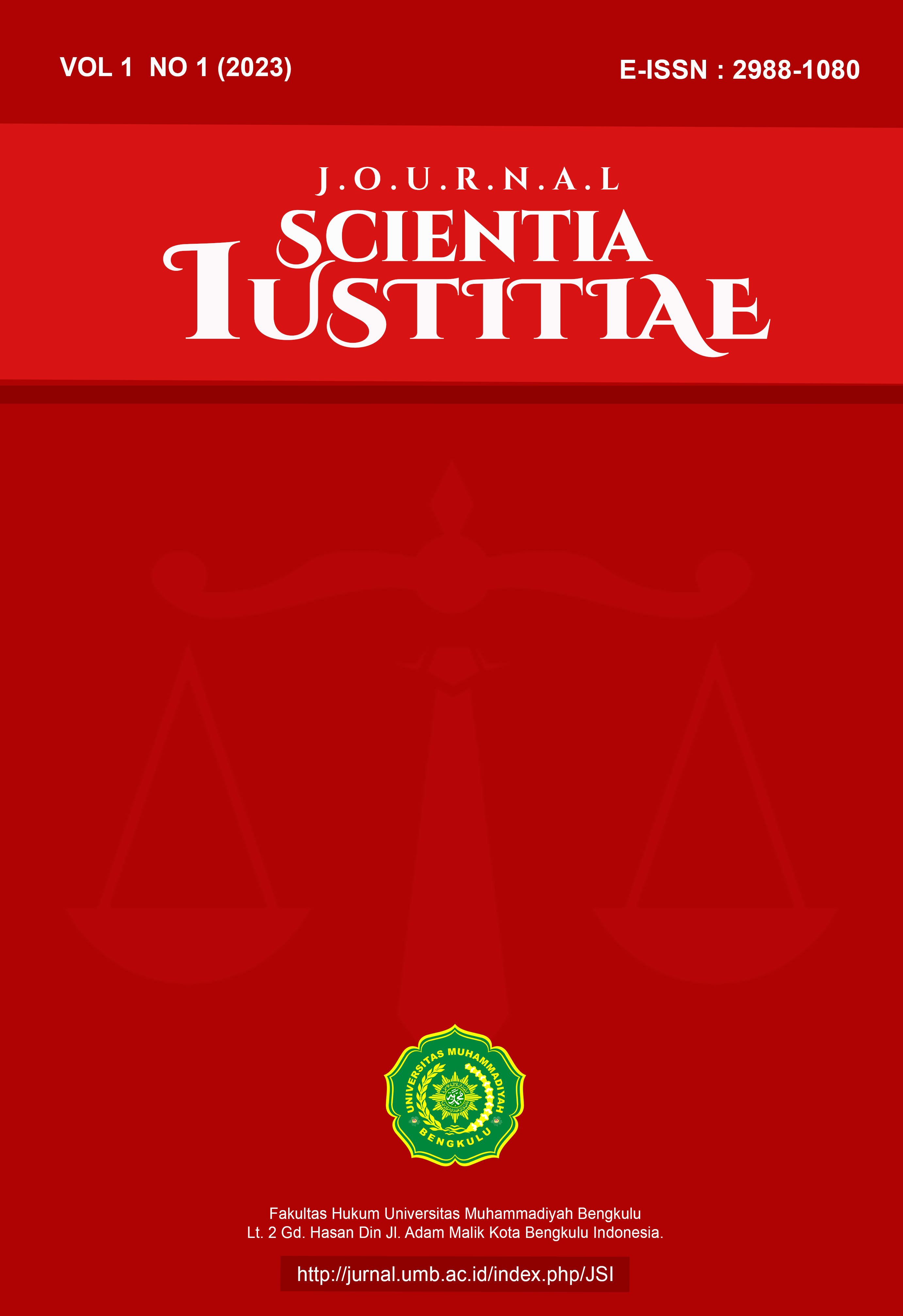 Journal Scientia Iustitiae is a national journal of law that is issued by the University of Muhammadiyah Bengkulu's Law Study Program. The Scientia Iustitiae journal publishes theoretical and empirical research targeted at improving the comprehension and application of Indonesian law in order to advance legal knowledge in both theory and practice. This journal gives top priority to publishing scholarly papers on common law, criminal law, civil and commercial law, legal reform, international law, and constitutional law in the context of bettering the development, renewal, and advancement of Indonesian law. Google Scholar, Garuda, and Crossref have all included the Journal Scientia Iustitiae in their indexes. Reputable e-sources will continue to be indexed by the Scientia Iustitiae Journal.