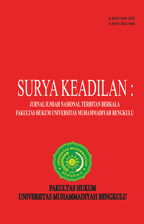 Surya Keadilan adalah jurnal ilmiah nasional di bidang hukum yang terbit secara berkala setiap tahunnya pada bulan Mei dan November yang diterbitkan oleh Fakultas Hukum Universitas Muhammadiyah Bengkulu. Artikel yang dimuat pada Jurnal Surya Keadilan kemudian akan dipublikasikan dalam bentuk cetak dan e-jurnal dalam rangka menyebarluaskan ilmu pengetahuan tentang ilmu hukum dalam negeri maupun luar negeri.