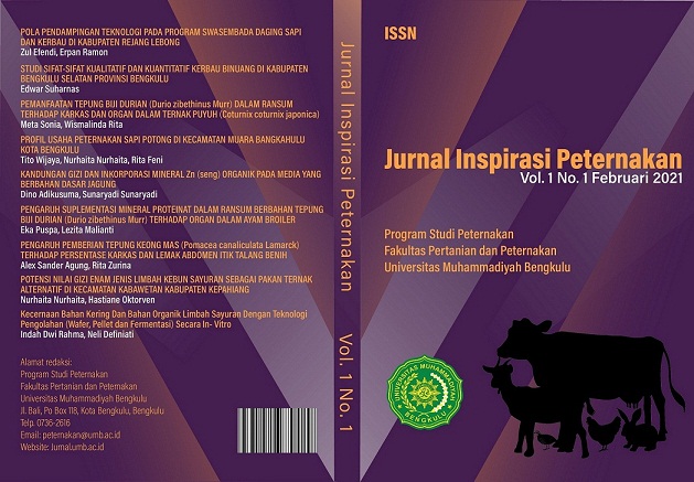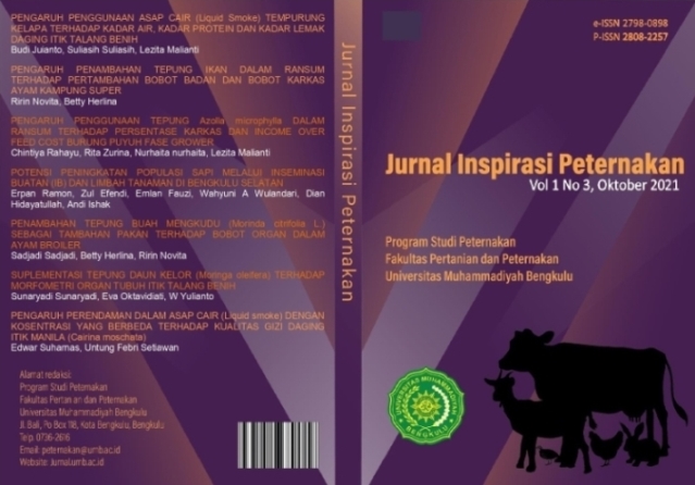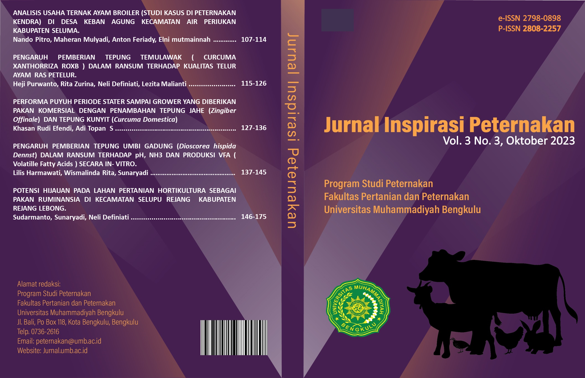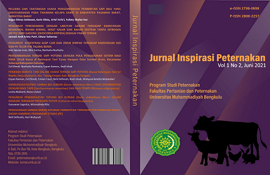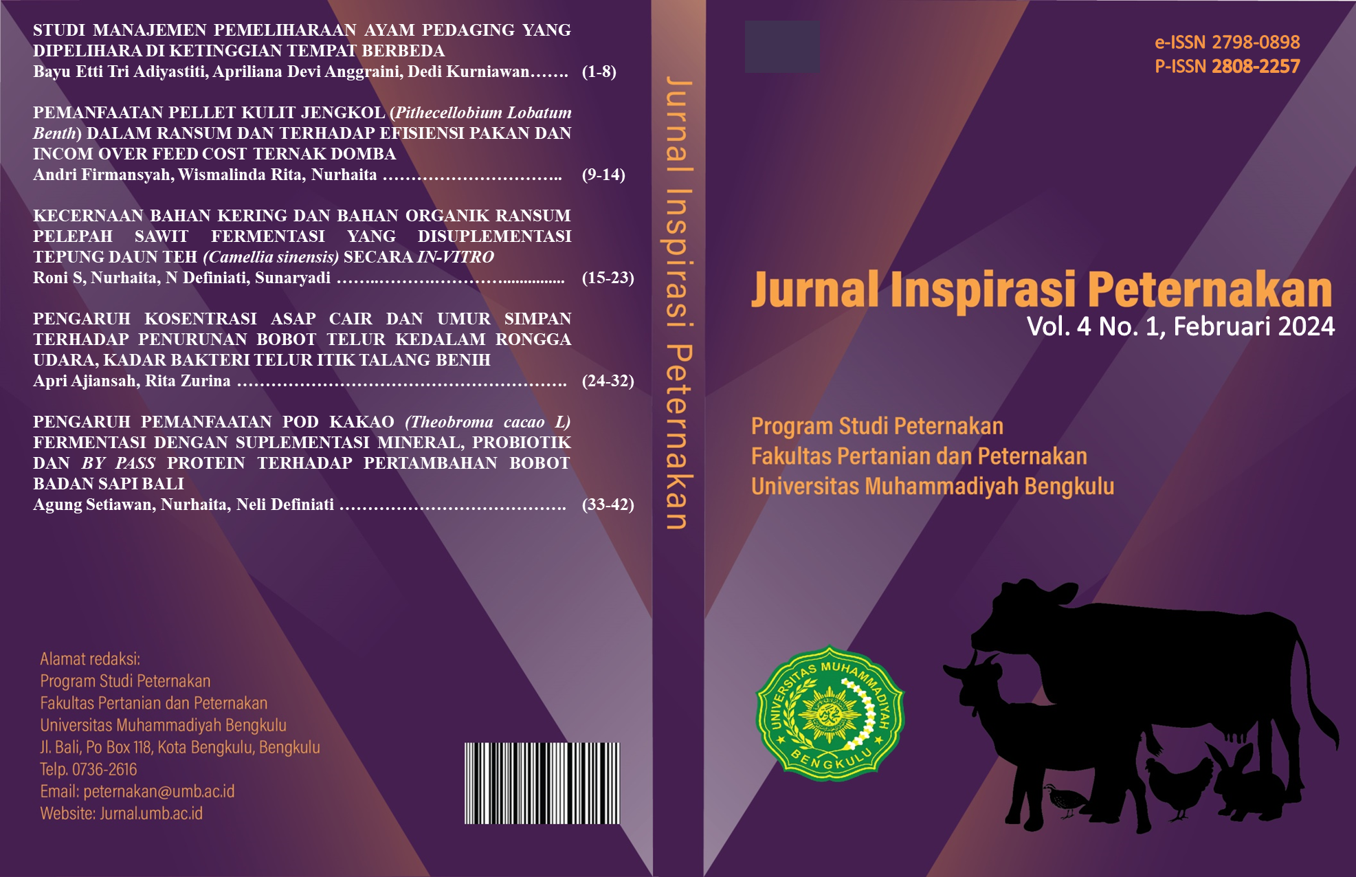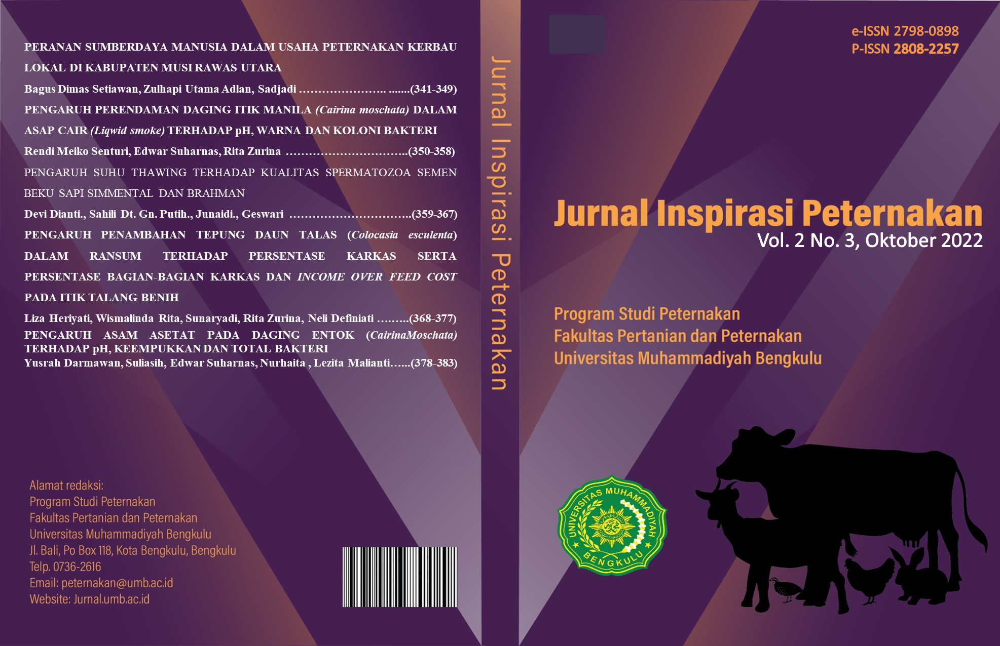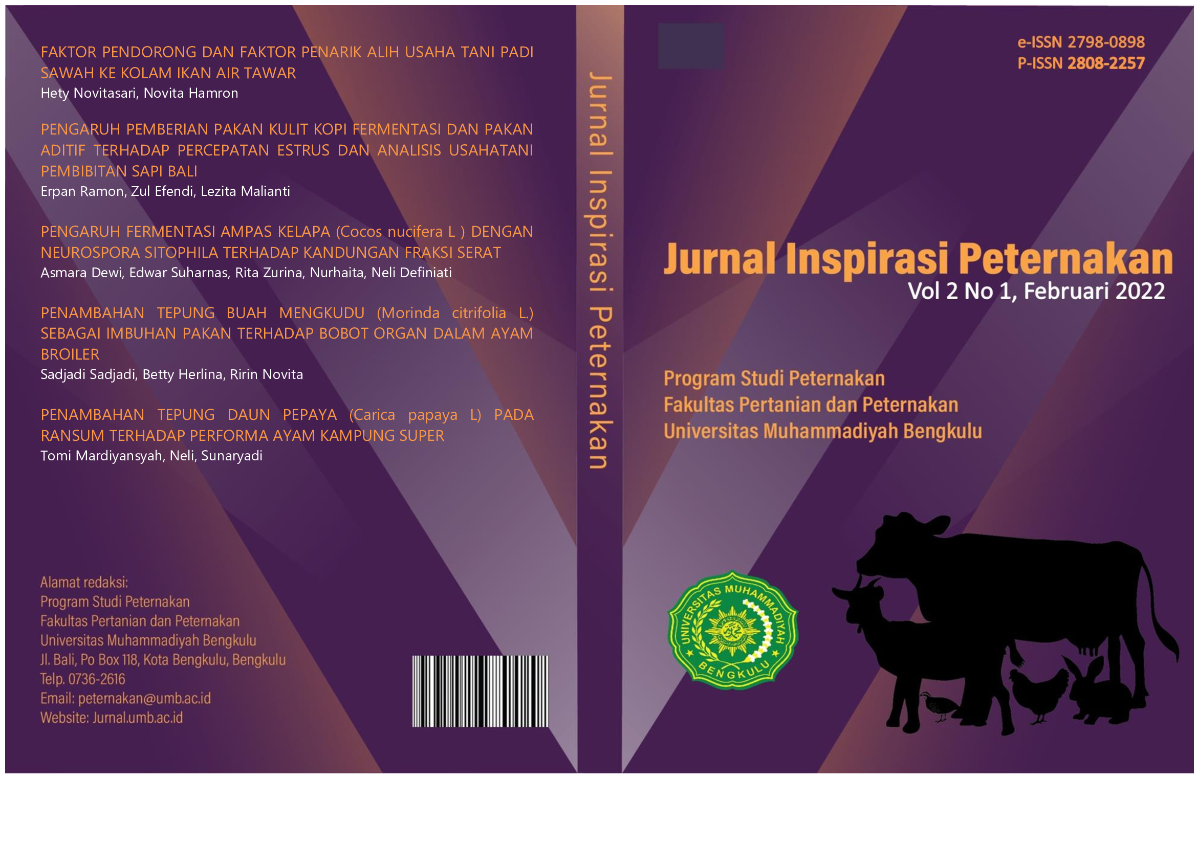 Jurnal Inspirasi Peternakan adalah jurnal ilmiah yang diterbitkan oleh Prodi Peternakan Fakultas Pertanian dan Peternakan Universitas Muhammadiyah Bengkulu. Jurnal Inspirasi Peternakan menerima artikel berbasis penelitian dan konseptual di bidang produksi ternak, nutrisi ternak, reproduksi dan genetik ternak, pakan ternak dan teknologi, hijauan, teknologi pasca panen dan sosial dan ekonomi peternakan yang belum pernah dipublikasikan sebelumnya. Artikel ilmiah diterbitkan berdasarkan peer-review double blind . berupa artikel hasil penelitian, artikel telaah pustaka, kasus lapangan dan gagasan asli. Jurnal ini terbit tiga kali dalam satu tahun, yaitu pada bulan Februari, Juni dan Oktober.